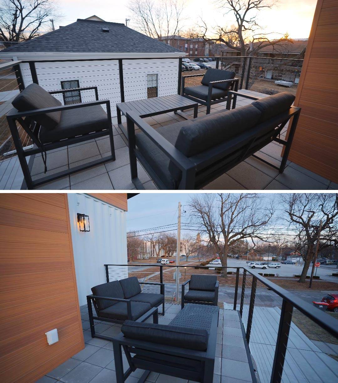 沒有想到的是這套集裝箱小別墅竟然還能設計出一個露臺,沒錯!推開臥室的一扇門就可以來到這個屋頂的露天陽臺了,這里擺放了戶外專用的沙發和茶幾,給我們提供了一個休閑和娛樂的多功能陽臺。約上幾個好友一同來露臺上喝茶聊天,看看遠處的風景,真的是小成本地度過了輕松愜意的周末時光。