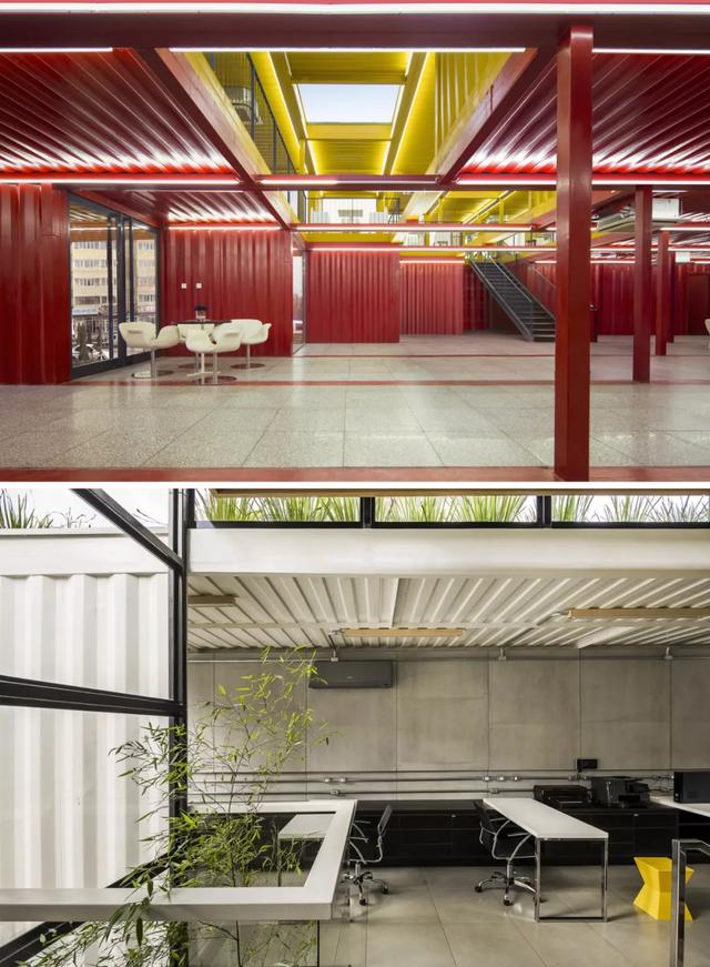 可以看到集裝箱建筑利用原有的鋼紋板重新涂刷后,就能形成極強的視覺沖擊力,并且由于其自身結構性能較好,因此可以形成懸挑、架空等豐富的空間形態。