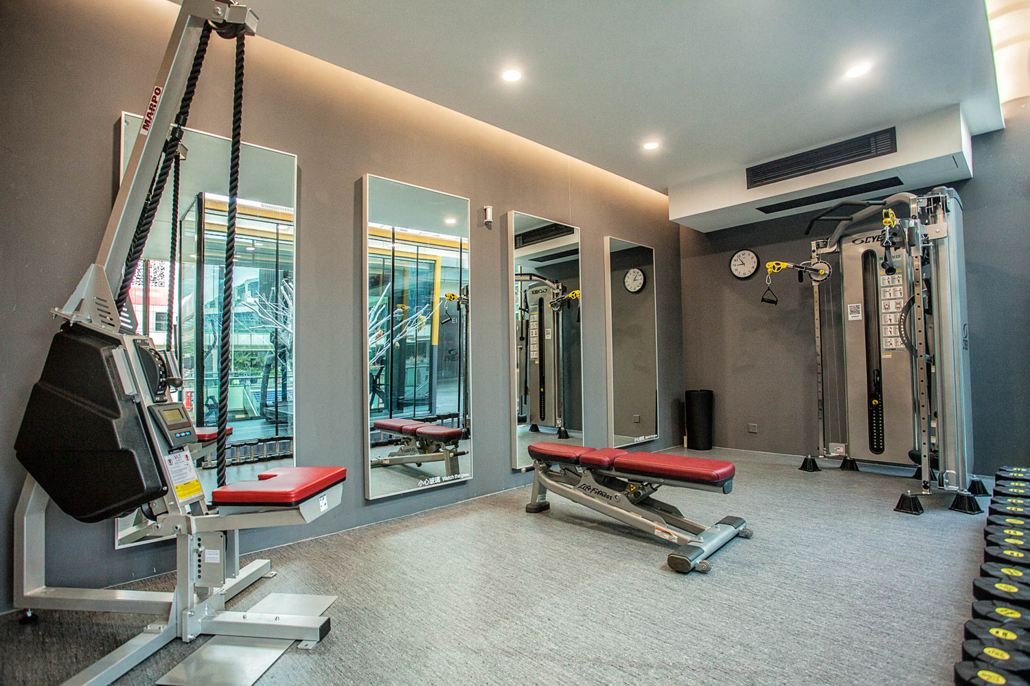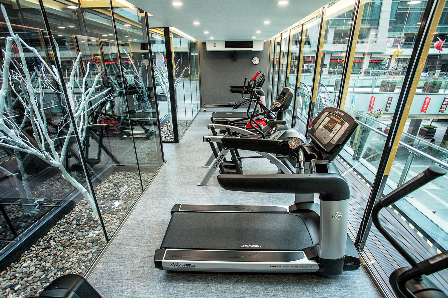 項目由兩個集裝箱拼接而成,中間為走廊,北側箱體面為落地玻璃,保證了艙體內部的通透性。總建筑面積86㎡,內部設有更衣室,有氧訓練區,力量訓練區。主要訓練器械有啞鈴,杠鈴,史密斯架,龍門架,跑步機,橢圓機,劃船機等。雖然沒有大型健身場館內的器械眾多,但是保證了普通用戶的使用需求。