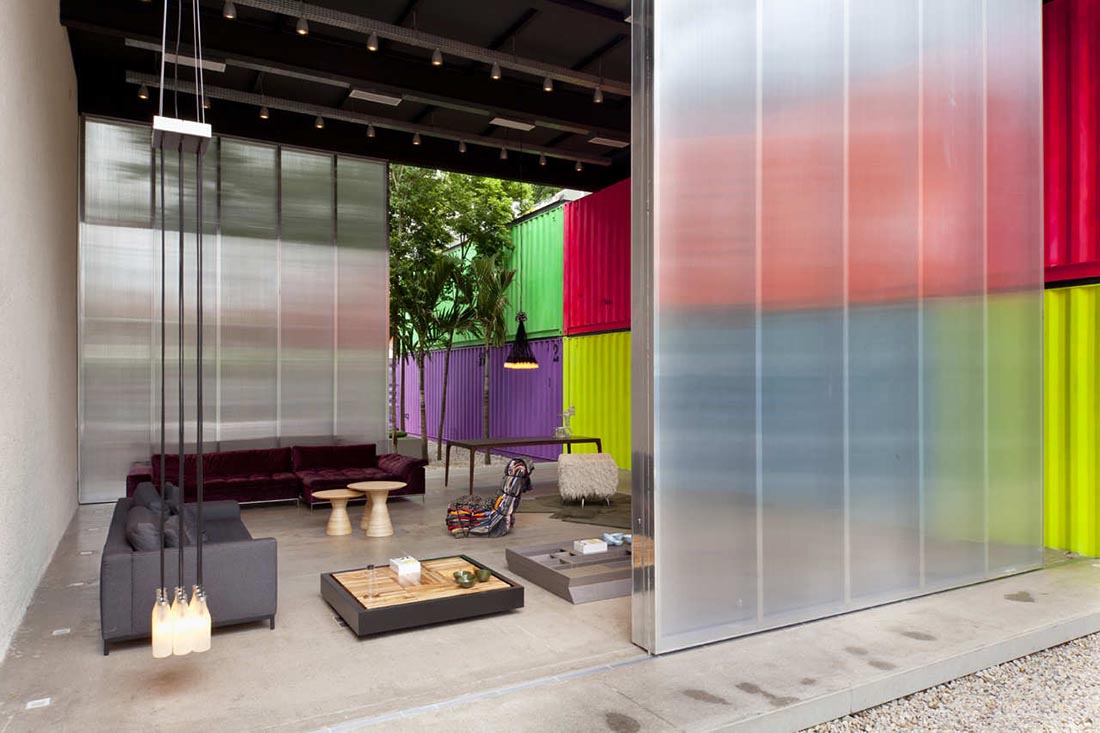 當時的想法是用二手的集裝箱,重新組成一個現成的對象。該項目利用集裝箱組織了兩條通道,同時其內部空間發揮線性的優勢,和一個雙層高度的體量依附于它,對比立方體體積。巨大的聚碳酸酯推拉門連接商店與城市的一個內花園。