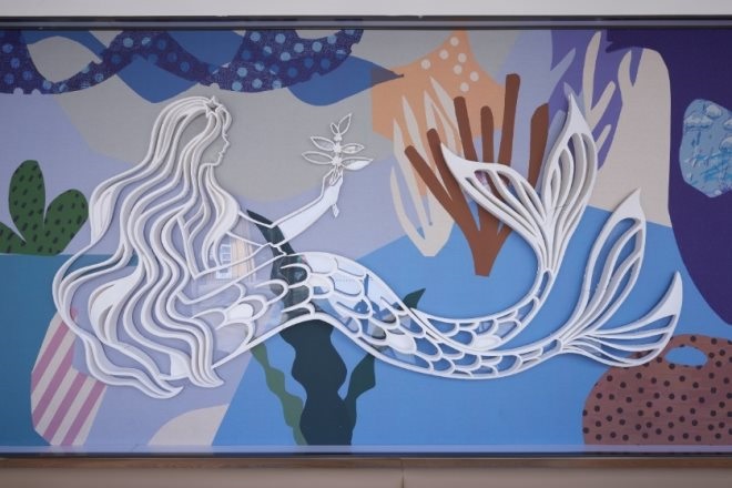 集裝箱空間都具有強烈的工業風和極簡風,所在的智慧灣科創園也是一個以集裝箱為主題的個性化定制園區,園內還有中國3D打印文化博物館,可以體驗3D打印技術互動。一層獨立箱體的用餐區墻上,就有一幅3D打印的巨幅星巴克美人魚作品。