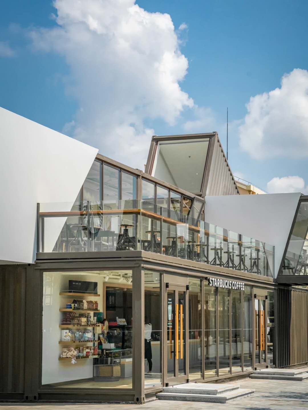 概念店由6個大小不同、白棕相間的集裝箱穿插交疊而成,共有兩層。一層是交錯開來的點單區和用餐區,并設置了大片通透的玻璃幕墻,從外界看可以將箱體內的整體面貌盡收眼底。